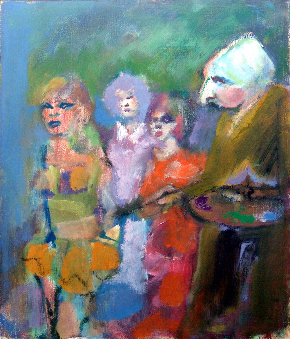 Mino Maccari 1898, Siena (Si) - 1989, Roma (Rm) - [Italia] Pittore e modelle olio su tela 30,5x25,7 cm 1975/1980 firma dell'artista sul retro; opera con cornice certificato di autenticità dell’Archivio Maccari; pubblicazione Calendario Galileo 1980