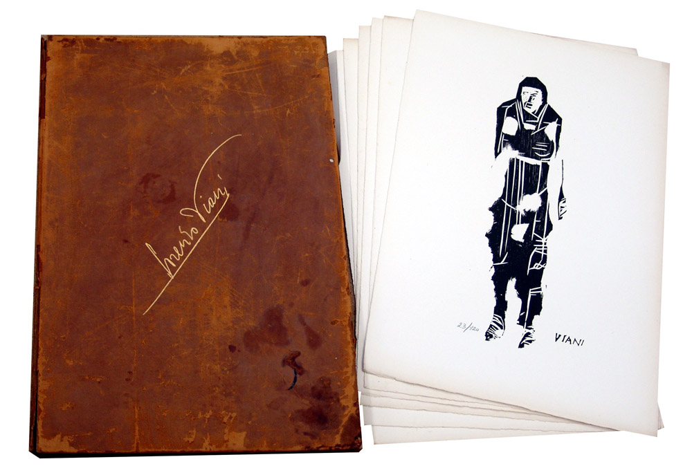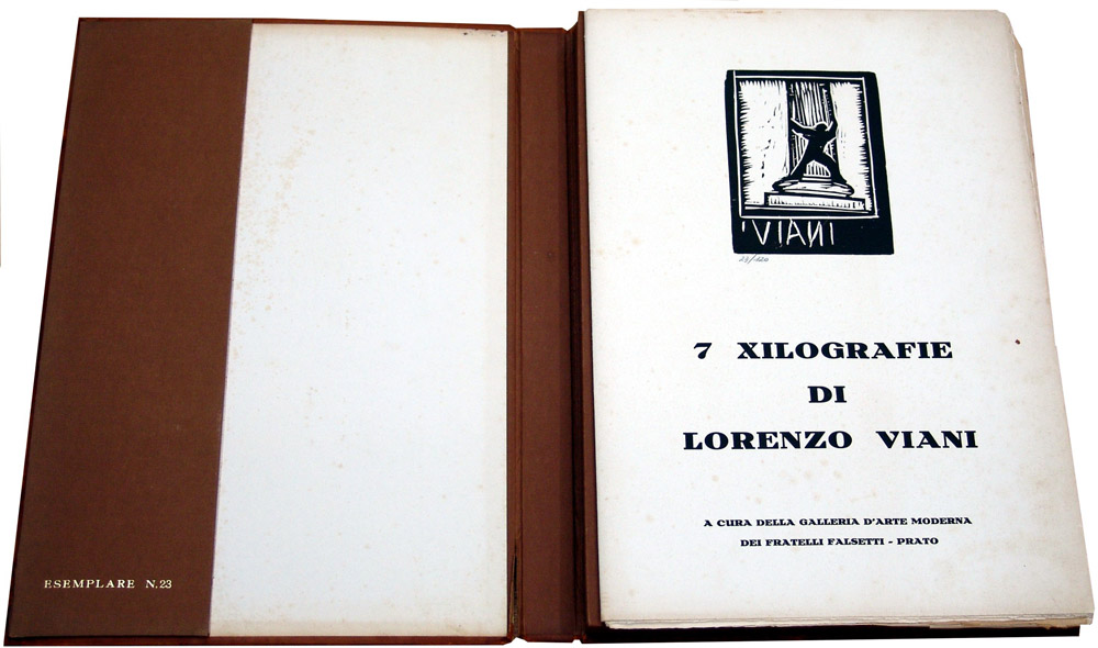 Lorenzo Viani 1882, Viareggio (Lu) - 1936, Lido di Ostia (Rm) - [Italia] 7 Xilografie di Lorenzo Viani xilografia 50x35 cm 1967 es. 23/120; collana di opere d’arte a cura della Galleria Falsetti di Prato; firmate a mano dall’editore; n. 6 tavole di originarie 7; produzione grafiche Giovacchini Firenze; cofanetto in tela formato 52x38 cm; cofanetto segnato dal tempo, una tavola piegata in un angolo certificato di autenticità Picenum
