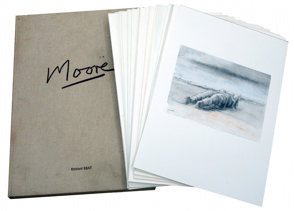 Henry Moore 1898, Castleford (Inghilterra) - 1986, Much Hadham (Inghilterra) - [Inghilterra] Moore a cura di Carmine Benincasa litografia 52x37 cm 1983 es. 992/3000; collana di opere d’arte con testi di Carmine Benincasa e Ann Garrould; Edizioni Seat; n. 50 tavole; stampa offset su carta Miliani di Fabriano; cofanetto in tela formato 55x40 cm