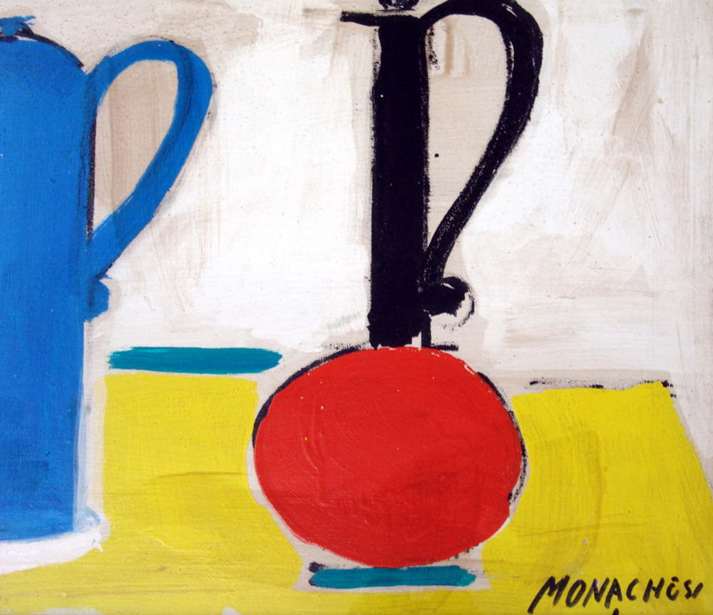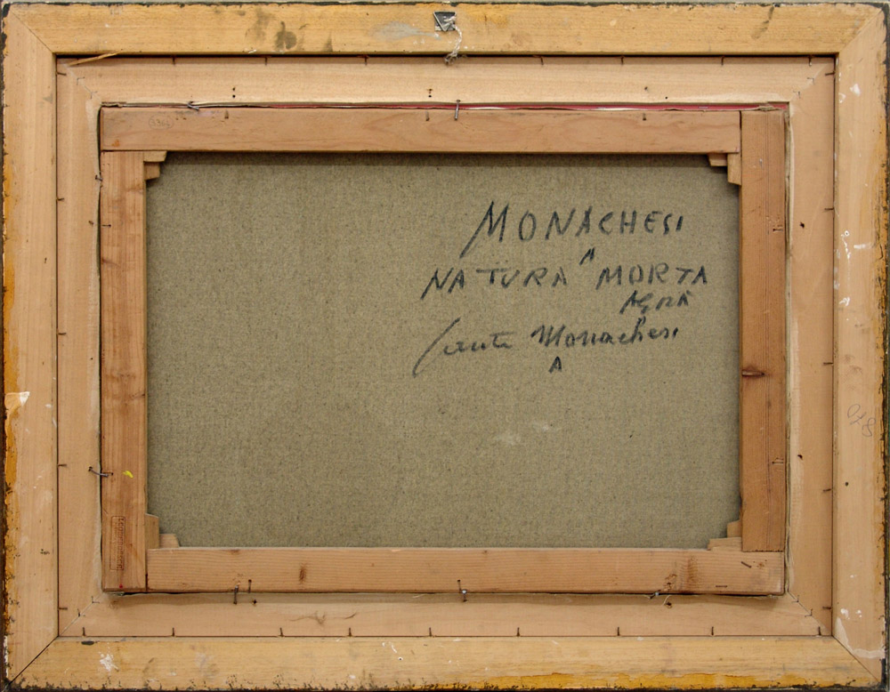 Sante Monachesi 1910, Macerata (Mc) - 1991, Roma (Rm) - [Italia] Natura morta olio su tela 50x70 cm firma dell’artista in basso a destra e sul retro; opera con cornice certificato di autenticità dell’artista su fotografia; timbro della Galleria Parametro Roma; codice di archivio