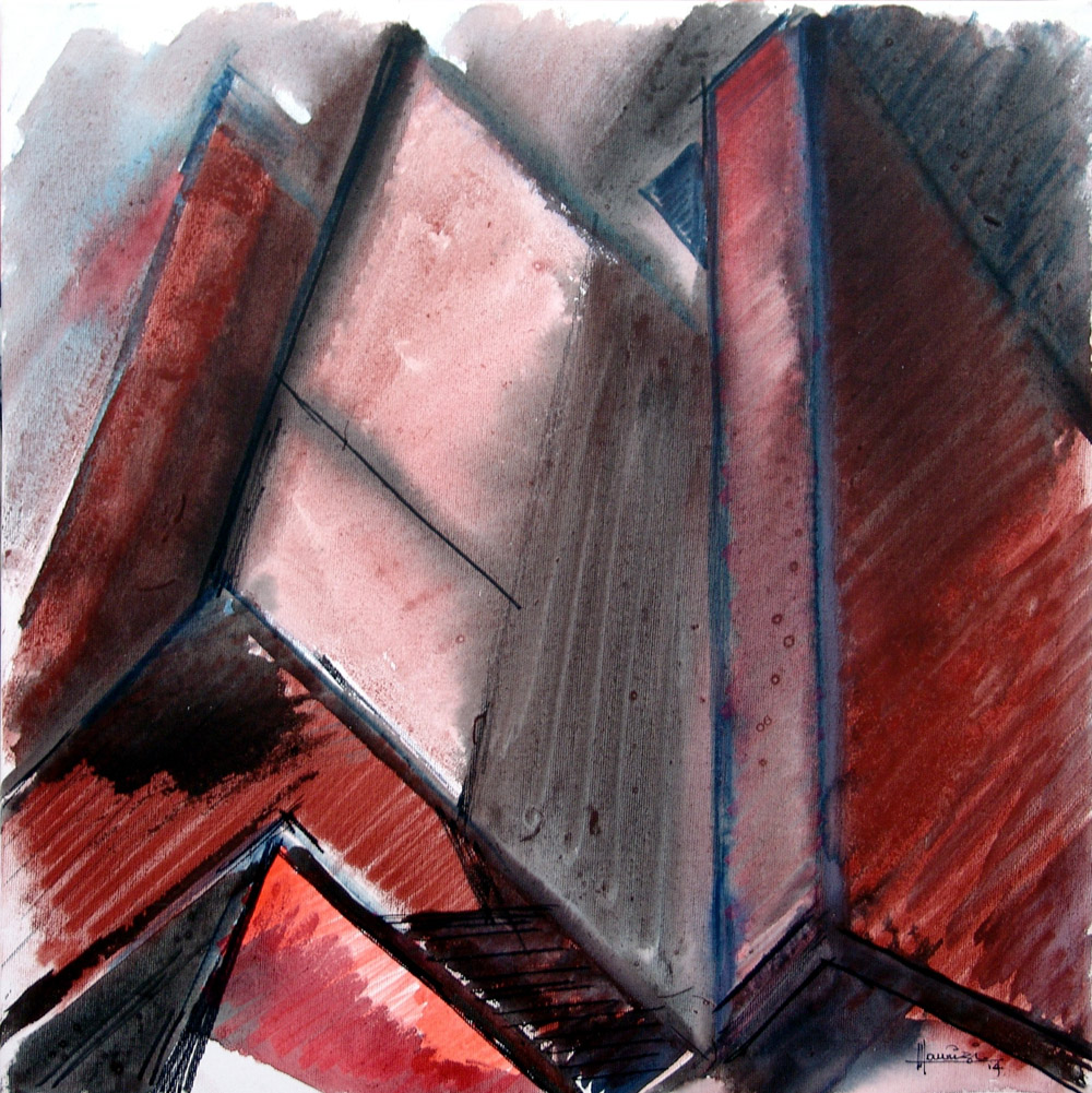 Tonino Maurizi 1940, Montecosaro (Mc) - [Italia] Il palazzo ingombrante colori ad acqua su tela 50x50 cm 2014 firma dell’artista in basso a destra e sul retro certificato di autenticità firmato dall’artista