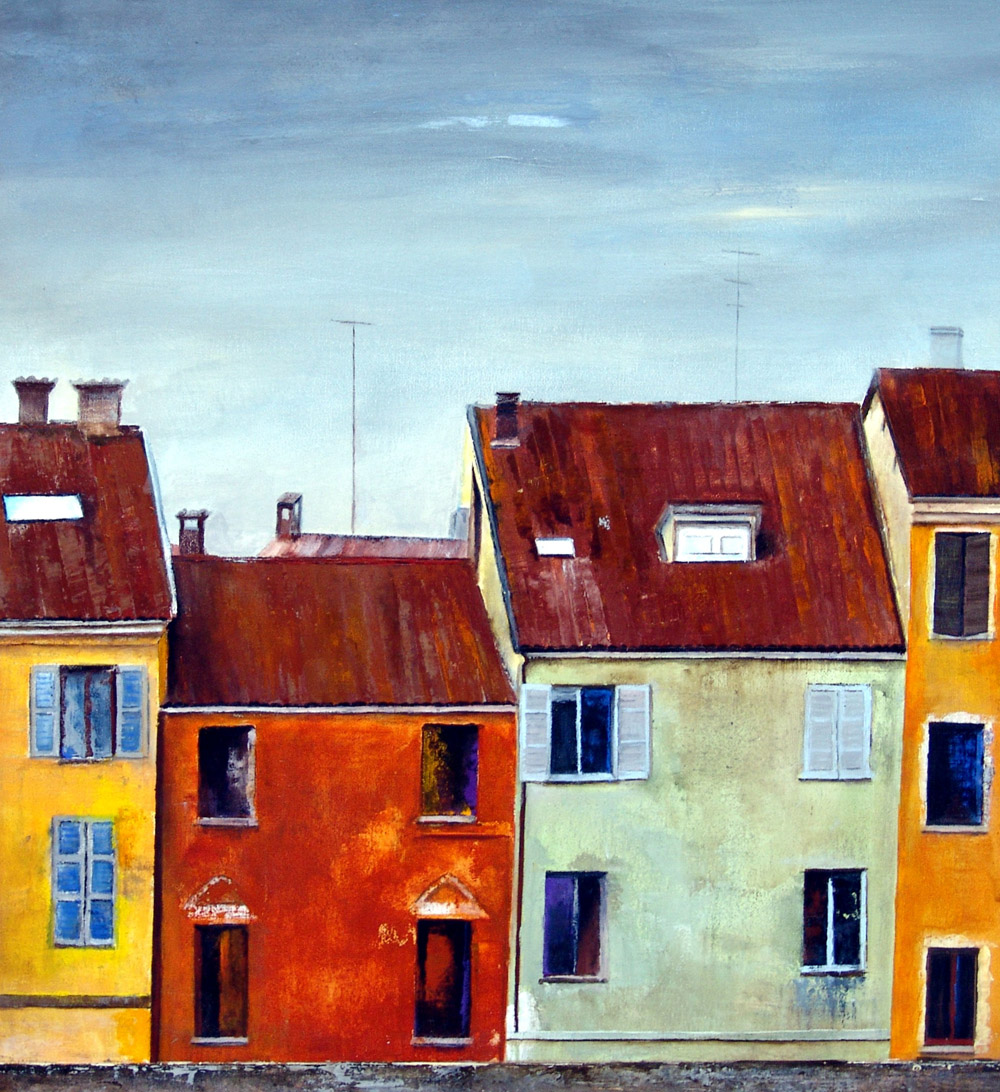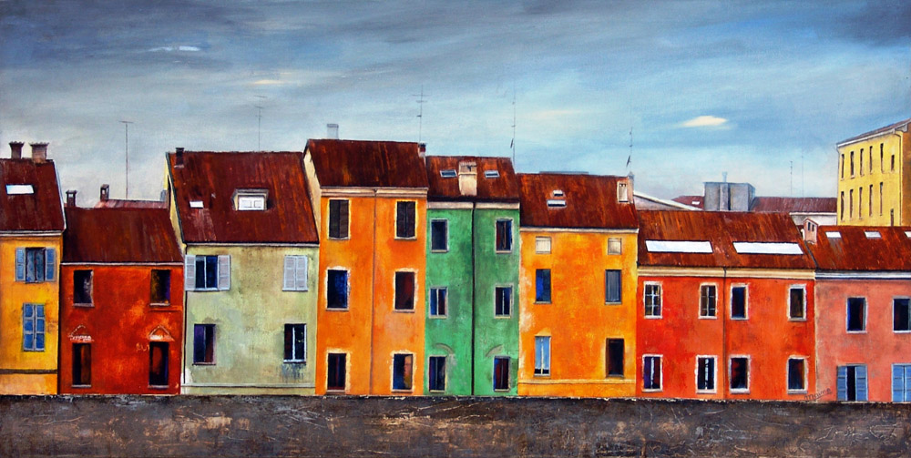 Gabriella Maino 1942, Verbania (Vb) - [Italia] Case oltre il muro acrilico su tela 50x100 cm 2012 firma dell'artista in basso a destra e sul retro certificato di autenticità firmato dall’artista
