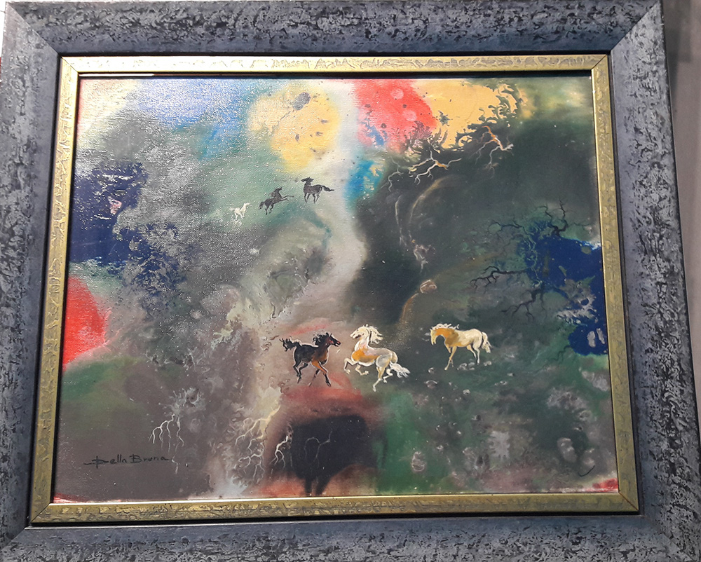 Arnaldo Della Bruna "Cavalli su monti" - Olio su tela applicata su tavola -1986 - cm 40x50 - Firma dell'artista in basso a sx
