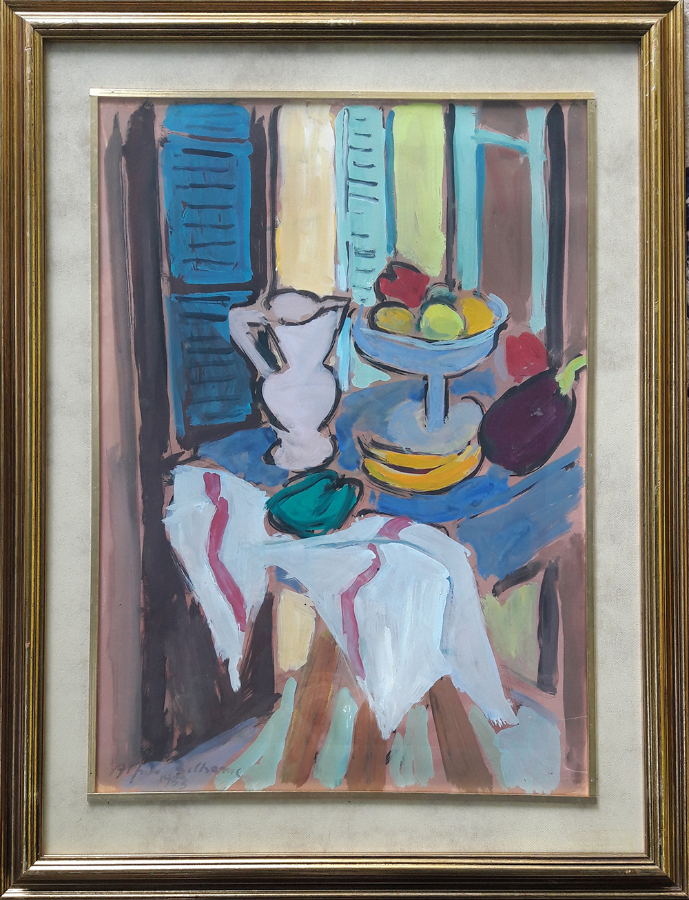 Alfredo Beltrame "Vaso, frutta e melanzana" 1983 - Tempera su cartoncino - cm 69 x 49 - Firma dell'artista in basso a sx - Etichetta al retro e provenienza Galleria Accademia TO