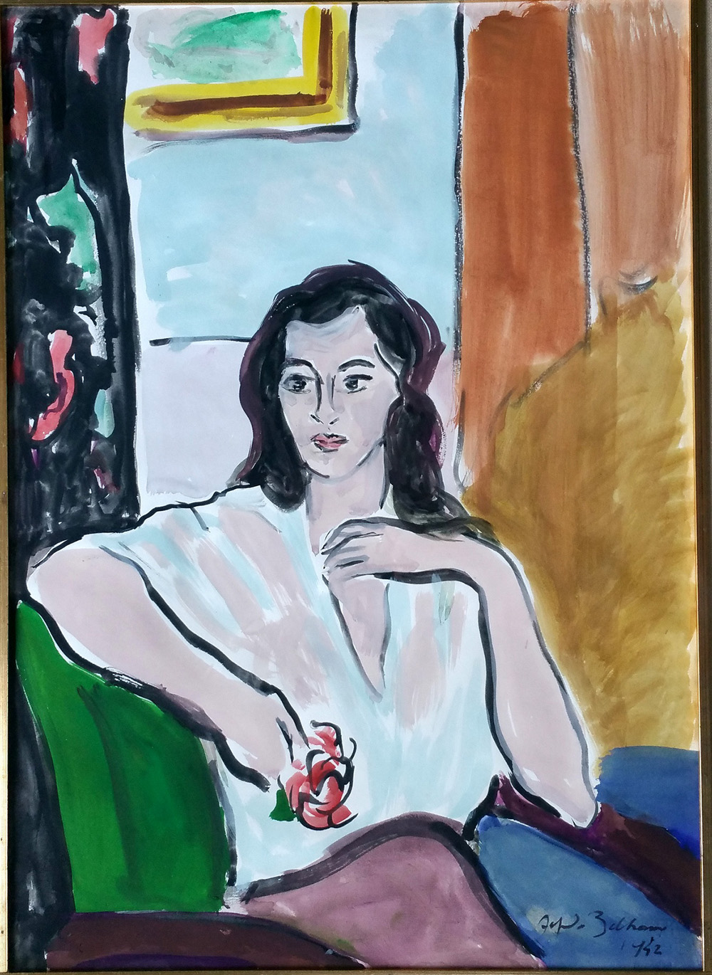 Alfredo Beltrame "Ragazza bruna con fiore" 1942 - Tempera su cartoncino - cm 70 x 50 - Etichetta al retro e provenienza Galleria Accademia TO