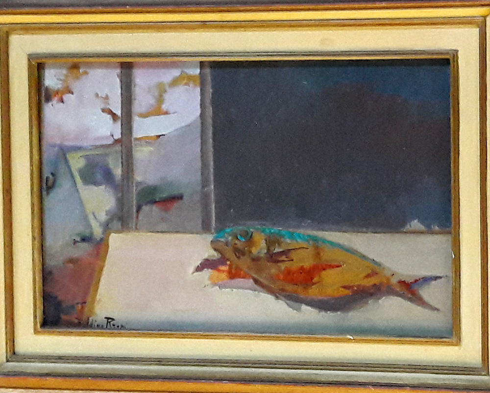 Faldino Rizzi "Natura morta con pesce" - Olio su cartoncino - cm 30x47 - Firma in basso a sx - Cartiglio biografico al retro