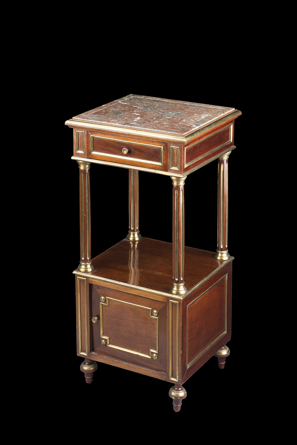 Comodino da centro in mogano ad un cassetto sottopiano sorretto da montanti a colonna scanalata, base ad un'anta poggiante su piedi torniti, profili in ottone, piano in marmo incassato. Fine sec. XIX (cm 42x90x42) A bedside mahogany table. Late 19th century (cm 42x90x42)
