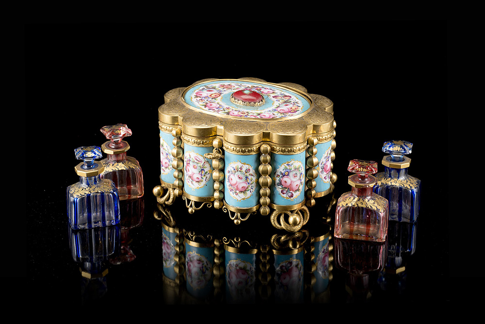 Manifattura francese sec. XIX. Cofanetto portaprofumi in porcellana a fondo azzurro decorato in policromia a fiori, con ghiere in bronzo dorato inciso a rose, bottiglie in vetro con volute e fiori dorati (difetti) 19th-century French manufacture. A porcelain and bronze box with glass scent bottles (defects)