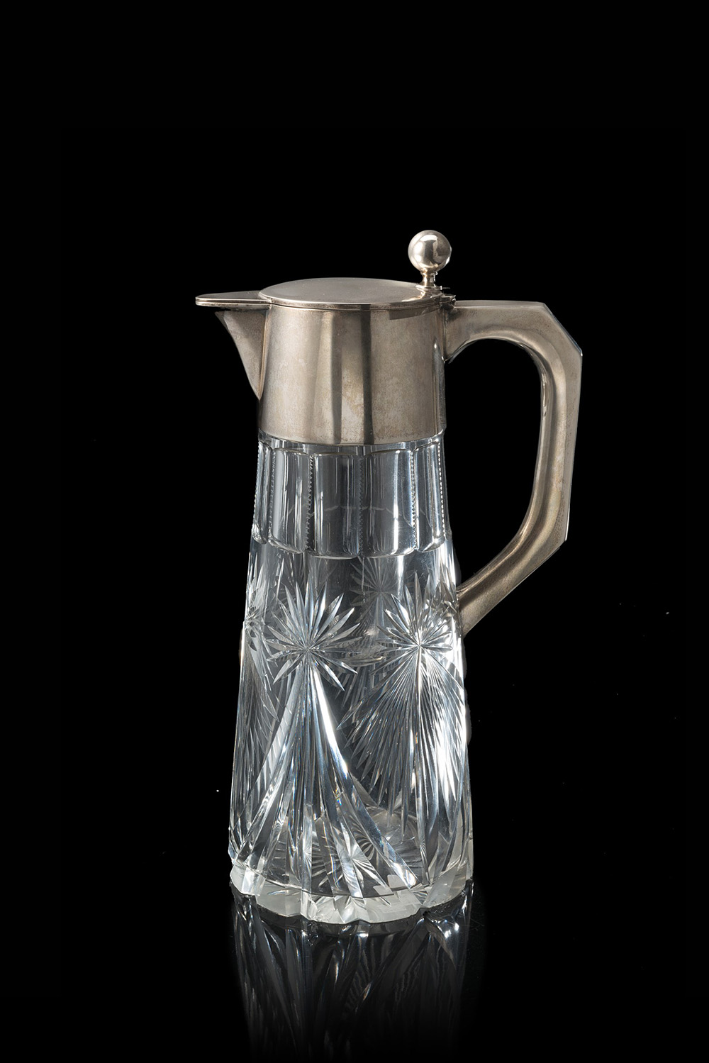 Brocca in cristallo molato con coperchio e manico in argento. Germania, sec. XX, marcata GiacchÈ Milano (h. cm 35 ca.) (lievi difetti) A silver and crystal ewer. Germany, 20th century. Signed GiacchÈ Milan (h. cm 35 ca.) (minor defects)