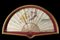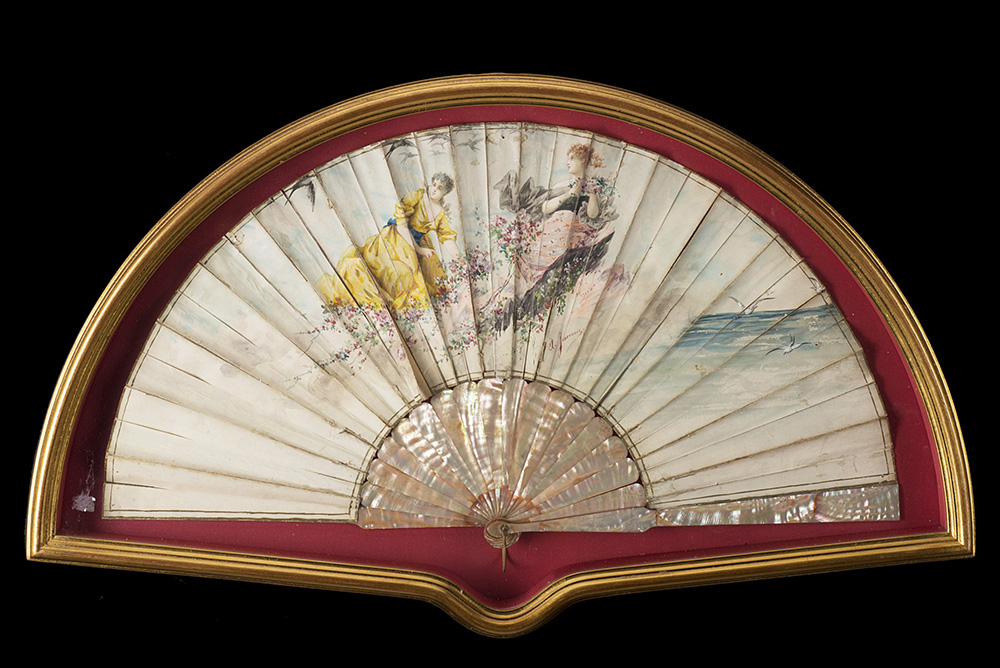Firma indecifrata. Ventaglio con stecche in madreperla, pagina in pergamena dipinta con allegoria della primavera firmata al centro. In teca di epoca posteriore (difetti) Undecipherable signature. Fan with mother of pearl ribs. Case of a later date (defcts)