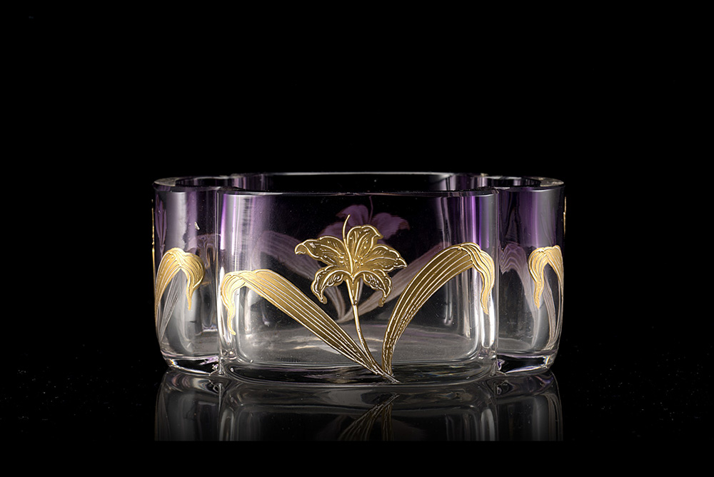 Manifattura inizio sec. XX. Ciotola polilobata in vetro incolore e violaceo decorato a dorature a fiori e foglie (cm 13x6x8,5) An early 20th-century glass bowl (cm 13x6x8,5)