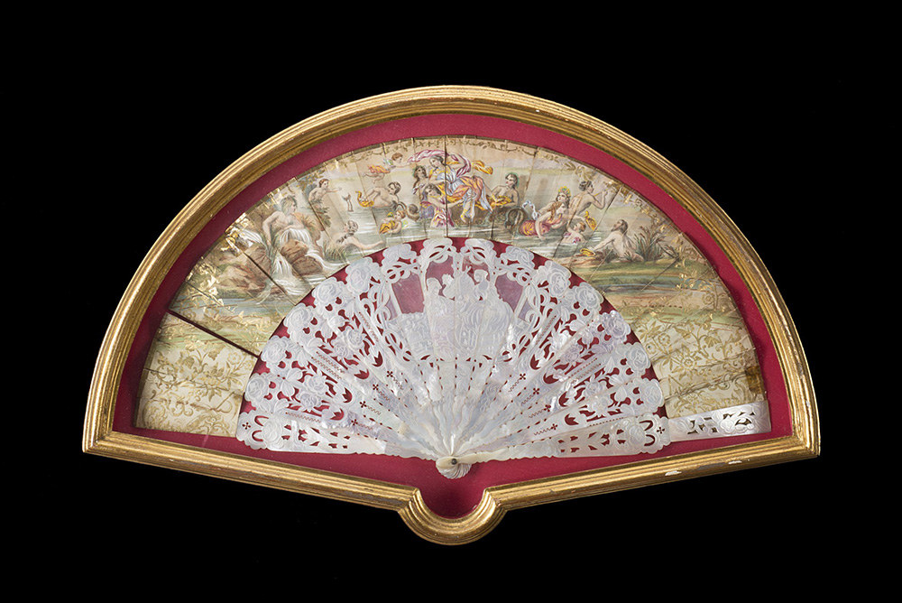 Ventaglio con stecche in madreperla incise e traforate a fiori e scena galante, pagina in carta decorata con scena mitologica e vestale in un paesaggio. Francia, sec. XIX. In teca di epoca posteriore (difetti) A fan with mother of pearl ribs. France, 19th century. Case of a later date (defects)