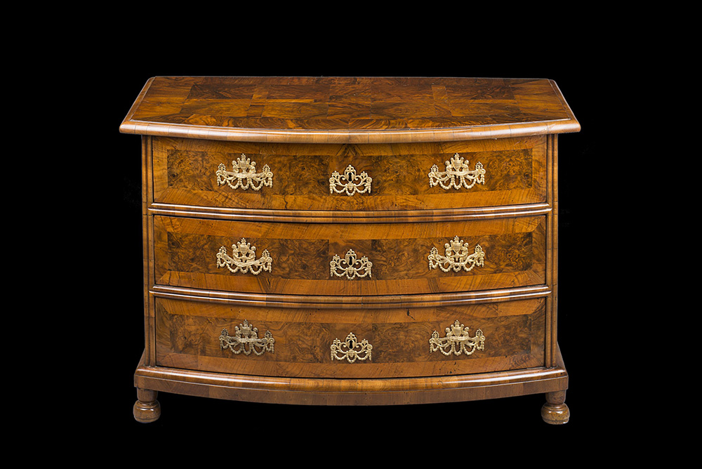 ComÚ di forma mossa a tre cassetti, con piano, fronte e fianchi lastronati in radica di noce, applicazioni in metallo dorato. Inizio sec. XIX (cm 117x80x67) (difetti e restauri) A gilt metal-mounted burr walnut veneered chest of drawers. Early 19th century (cm 117x80x67) (defects and restorations)