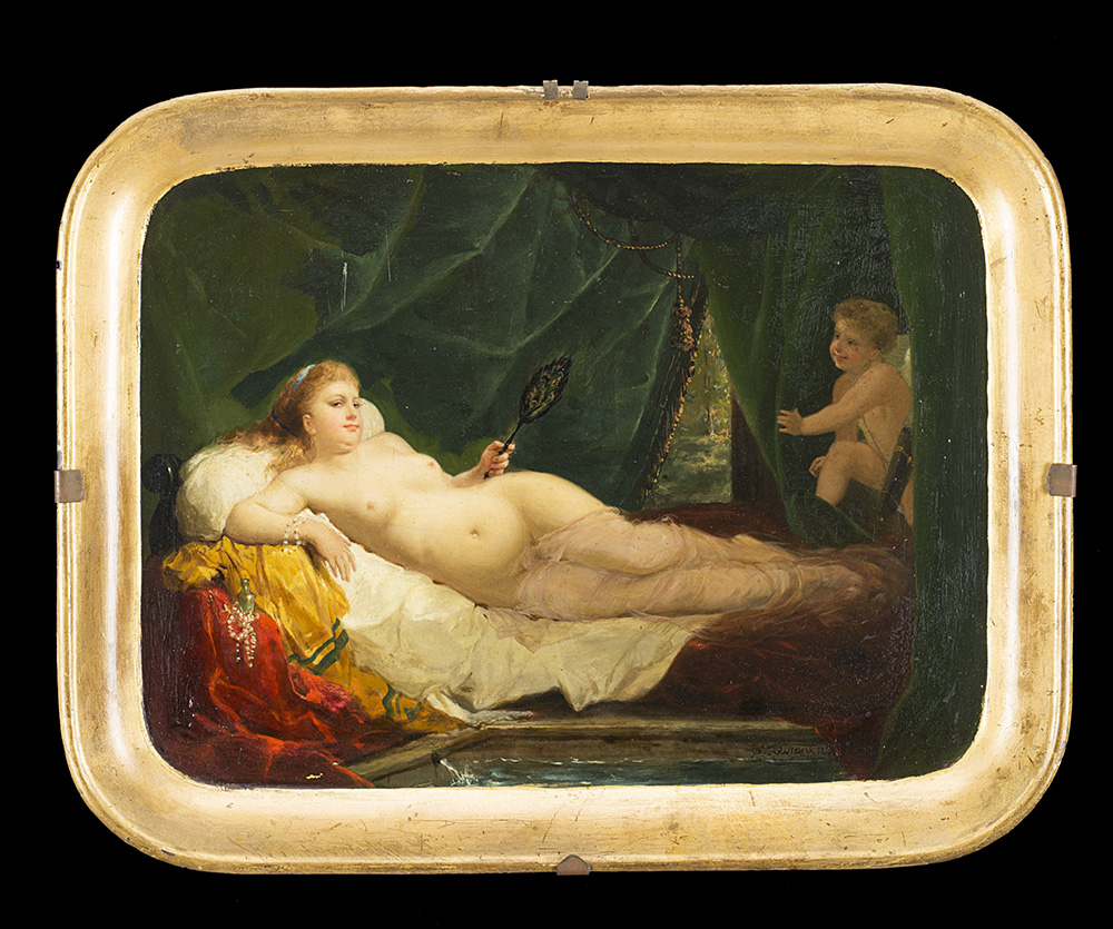 Firma indecifrata "Nudo femminile con putto" dipinto ad olio su vassoio (cm 36.5x47) Firmato e datato 1874 in basso a destra (difetti) Undecipherable signature. An oil painting on metal tray (cm 36.5x47) Signed and dated 1874 (defects)
