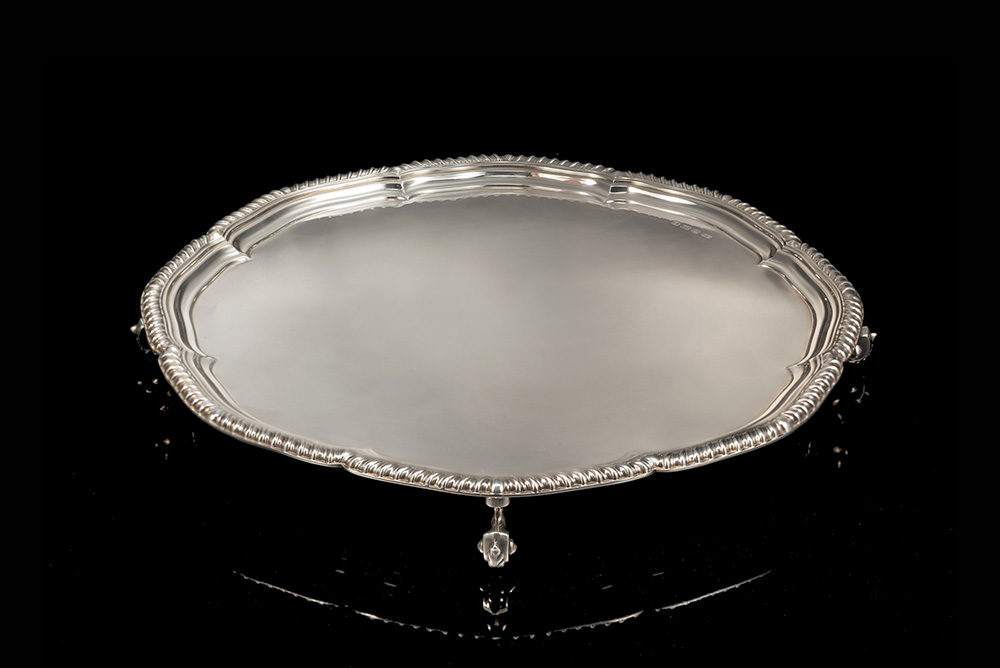 Salver in argento di forma circolare sagomata con fondo liscio e bordura godronata e modanata; piedini a voluta fogliata. Citt‡ di Sheffield, 1938. Argentiere Viner's Ltd. (d cm 37) (gr 1240 ca.) (lievi difetti) A silver salver. Silversmith Viner's Ltd, Sheffield 1938 (d cm 37) (gr 1240 ca.) (minor defects)