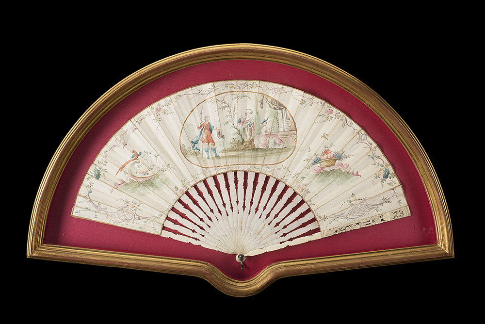 Ventaglio con stecche in avorio sagomato. Pagine in carta dipinta entro riserve a motivi vegetali e volatile, decorata al centro con scena galante in un paesaggio. Sec. XVIII, contenuto in teca di epoca posteriore A fan with ivory ribs. 18th century. Case of a later date