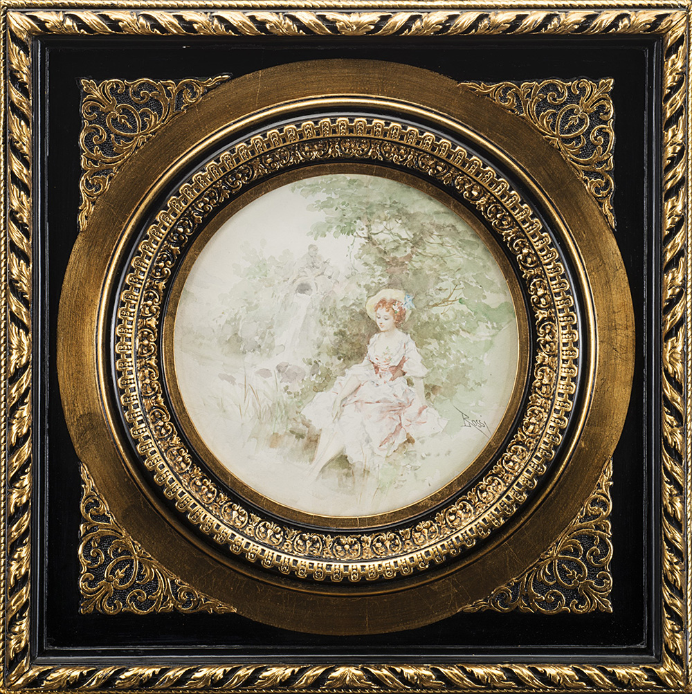 Lucius Rossi (Roma 1846 - Parigi 1913) "Fanciulla nel verde giardino" acquerello su carta (d. cm 22) Firmato in basso a destra. In cornice di legno ebanizzato e dorato Lucius Rossi (Rome 1846 - Paris 1913) "Young lady in a garden" watercolour on paper (d. cm 22) Signed and framed