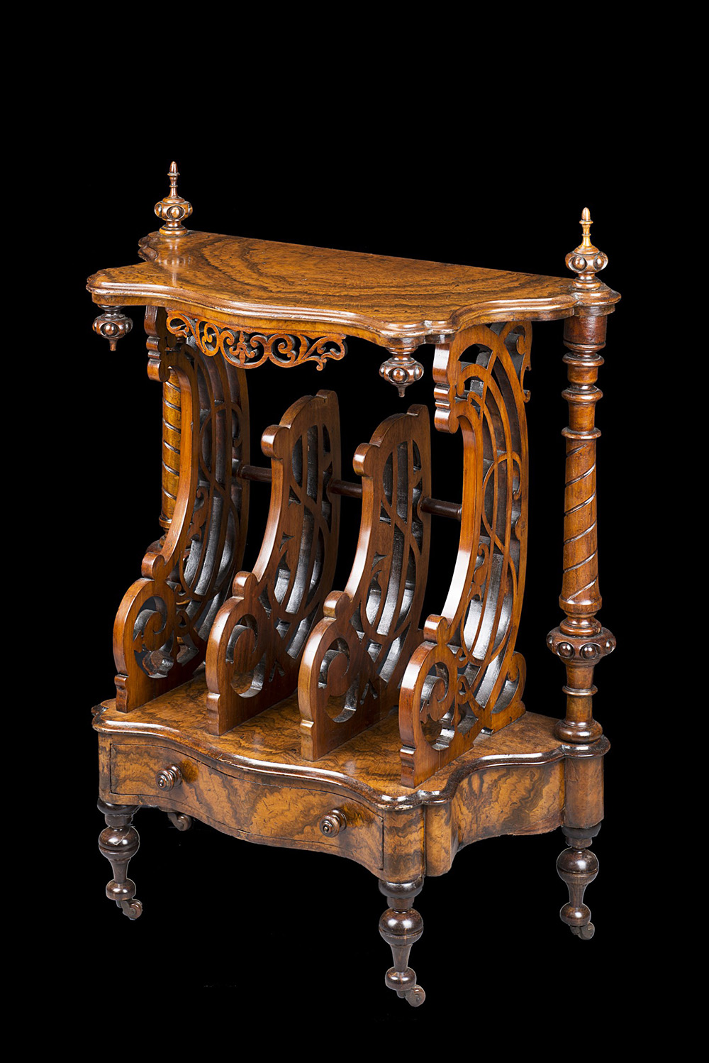 EtagËre in noce con piano di forma mossa sostenuto da due colonne a tutto tondo, montanti traforati, un cassetto alla base. Sec. XIX (cm 76x107x37) A 19th century walnut ÈtagËre (cm 76x107x37)