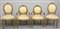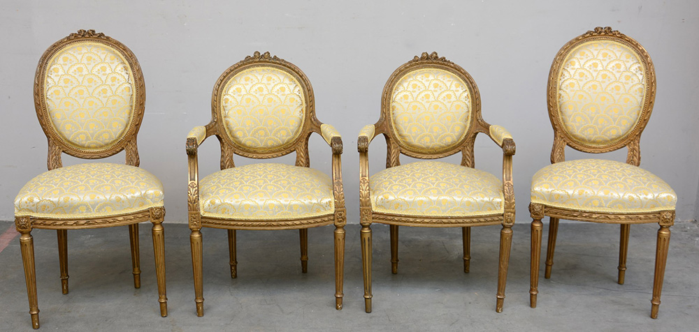 Fornitura da camera rivestita in seta in legno intagliato e dorato, con cimasa scolpita a fiori, braccioli a ricciolo e gambe scanalate. Composta da una coppia di poltroncine e una coppia di sedie. Sec. XIX (difetti) A living room set comprising a pair of giltwood chairs and a pair of armchairs. 19th century (defects)