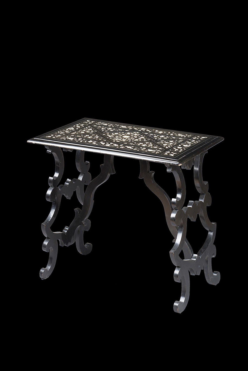 Tavolo fratino in legno ebanizzato e intarsiato in avorio e filettato in...