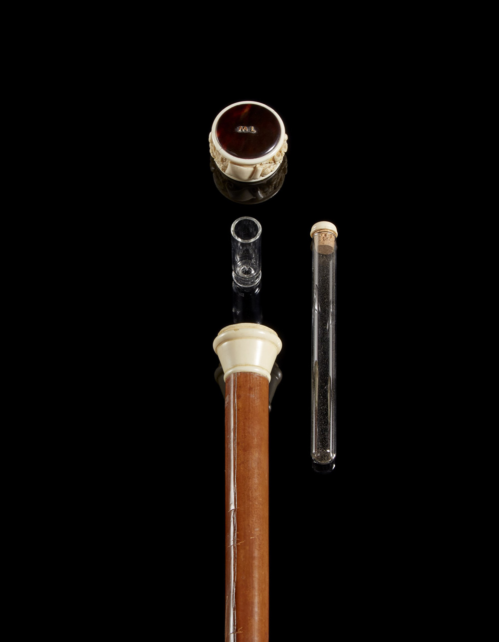 Bastone con canna in malacca e impugnatura in avorio scolpita nella fascia a ghiande e foglie. Coperchio in tartaruga con cifre "M.L." in oro basso celante fiasca e bicchierino in vetro. Sec. XIX (difetti) A Malacca walking stick with ivory handle containing flask and glass. Tortoiseshell cover with gold initials "M.L.". 19th century (defects)