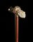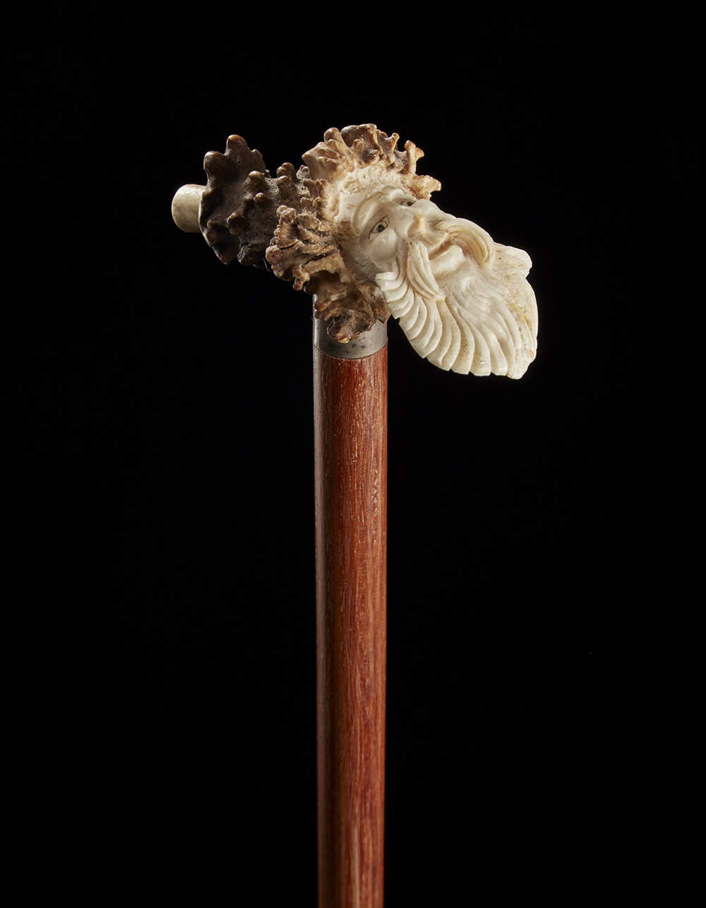 Bastone con canna in legno decorata sui nodi in oro. Presa scolpita a facce grottesche con occhi in vetro. Ghiera in oro. Sec. XIX (mancanze e restauri) A wood walking stick with gold inserts and collar. 19th century (losses and restorations)