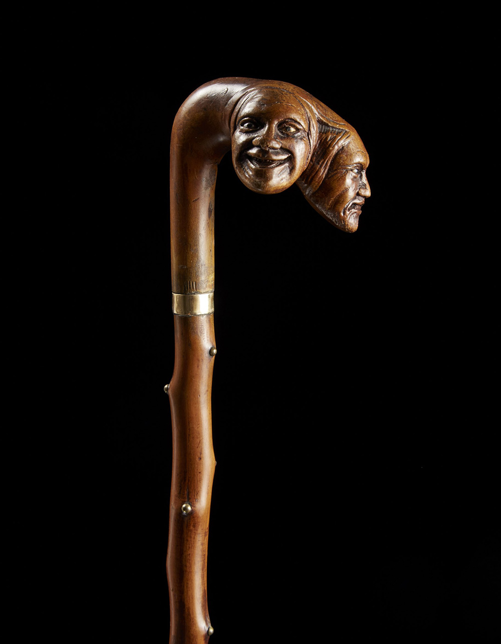 Bastone con canna in legno e presa in corno a tabacchiera scolpita a testa di uomo con barba. Austria sec. XIX A wood walking stick with horn handle. Austria, 19th century