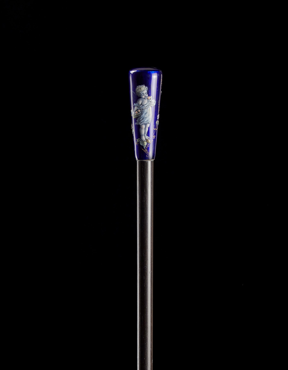 Bastone in ebano con presa in smalti decorata a figura alata con frutta e fiori. Francia, sec. XIX An ebony walking stick with enamelled handle. France, 19th century