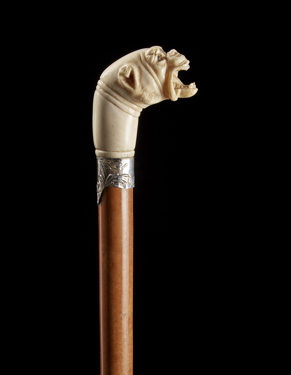 Bastone con canna in malacca e impugnatura in avorio scolpita a testa di cane con occhi in vetro. Ghiera in argento inciso a cifre "S.B" e decorato a foglie. Inghilterra, sec. XIX A Malacca walking stick with ivory handle. Silver collar ciphered "S.B". England, 19th century