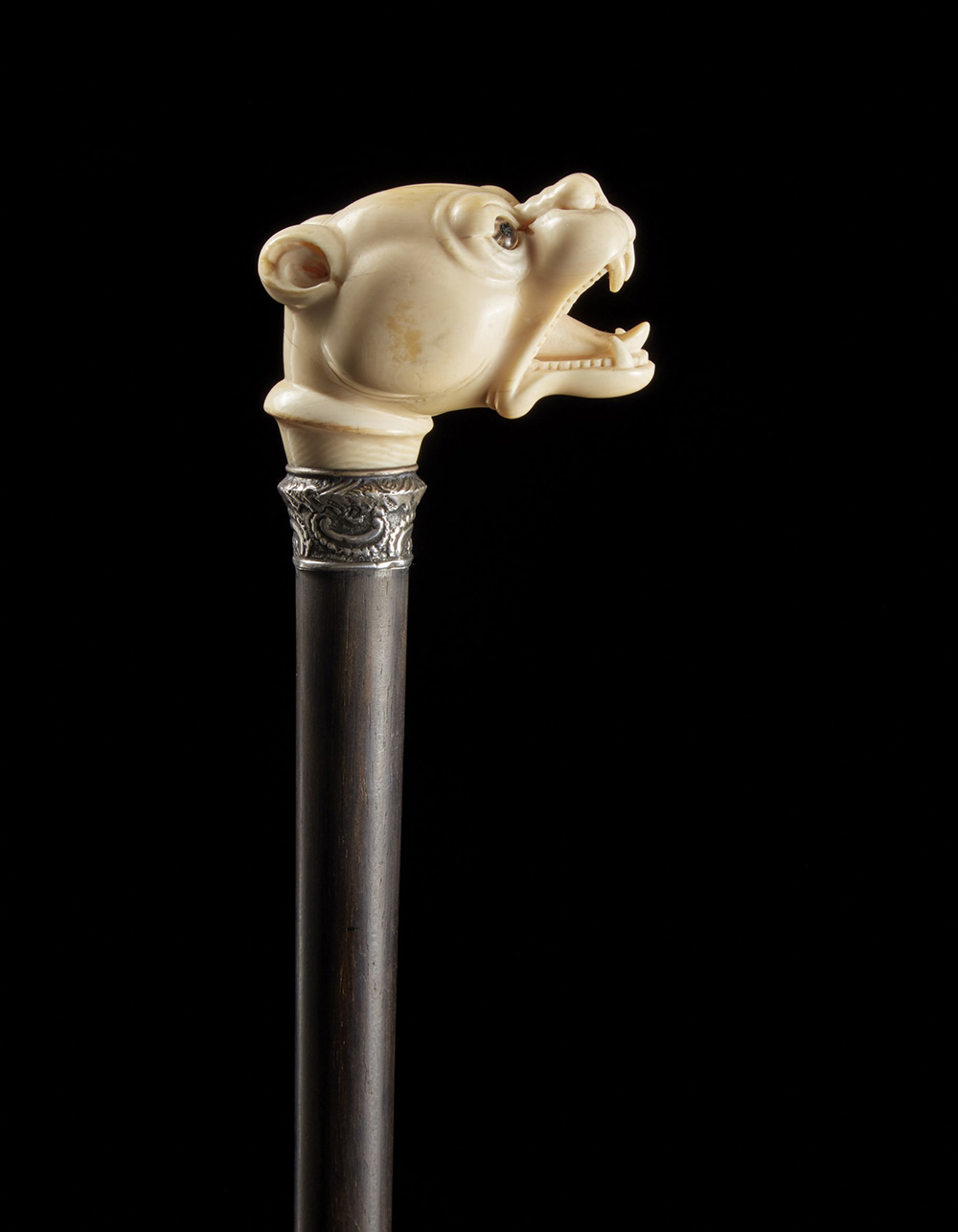 Bastone con canna in ebano e impugnatura in avorio scolpita a testa di cane con occhi in vetro. Ghiera in argento inciso a cifre e decorato a foglie. Inghilterra, sec. XIX An ebony walking stick with ivory handle and silver collar. England, 19th century