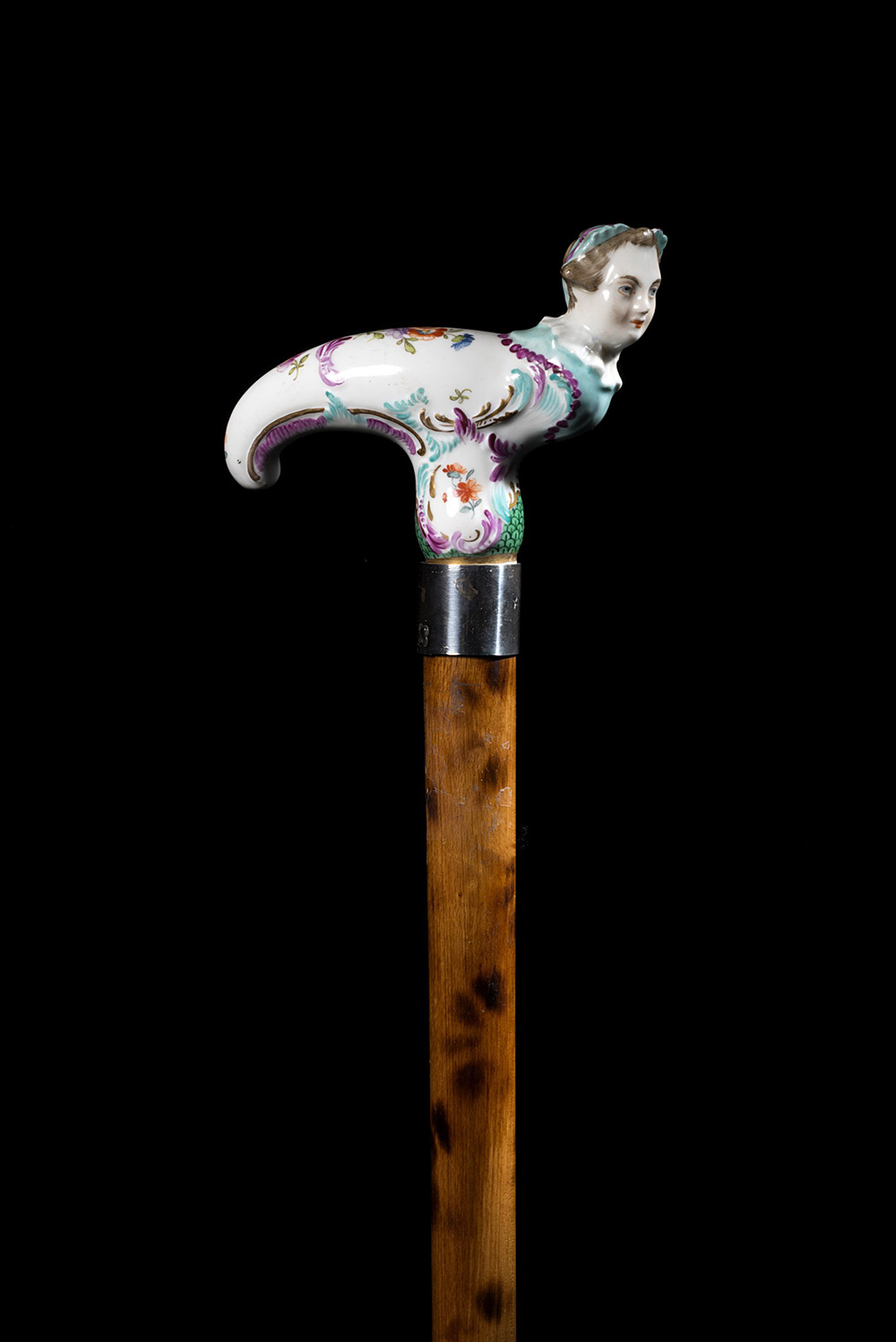Bastone con canna in legno e impugnatura in porcellana di Messein decorata a volto femminile, volute e fiori in policromia. Ghiera in argento. Marchi Citt‡ di Sheffield dal 1918 A wood walking stick with Meissen porcelain handle. Silver collar, Sheffield from 1918