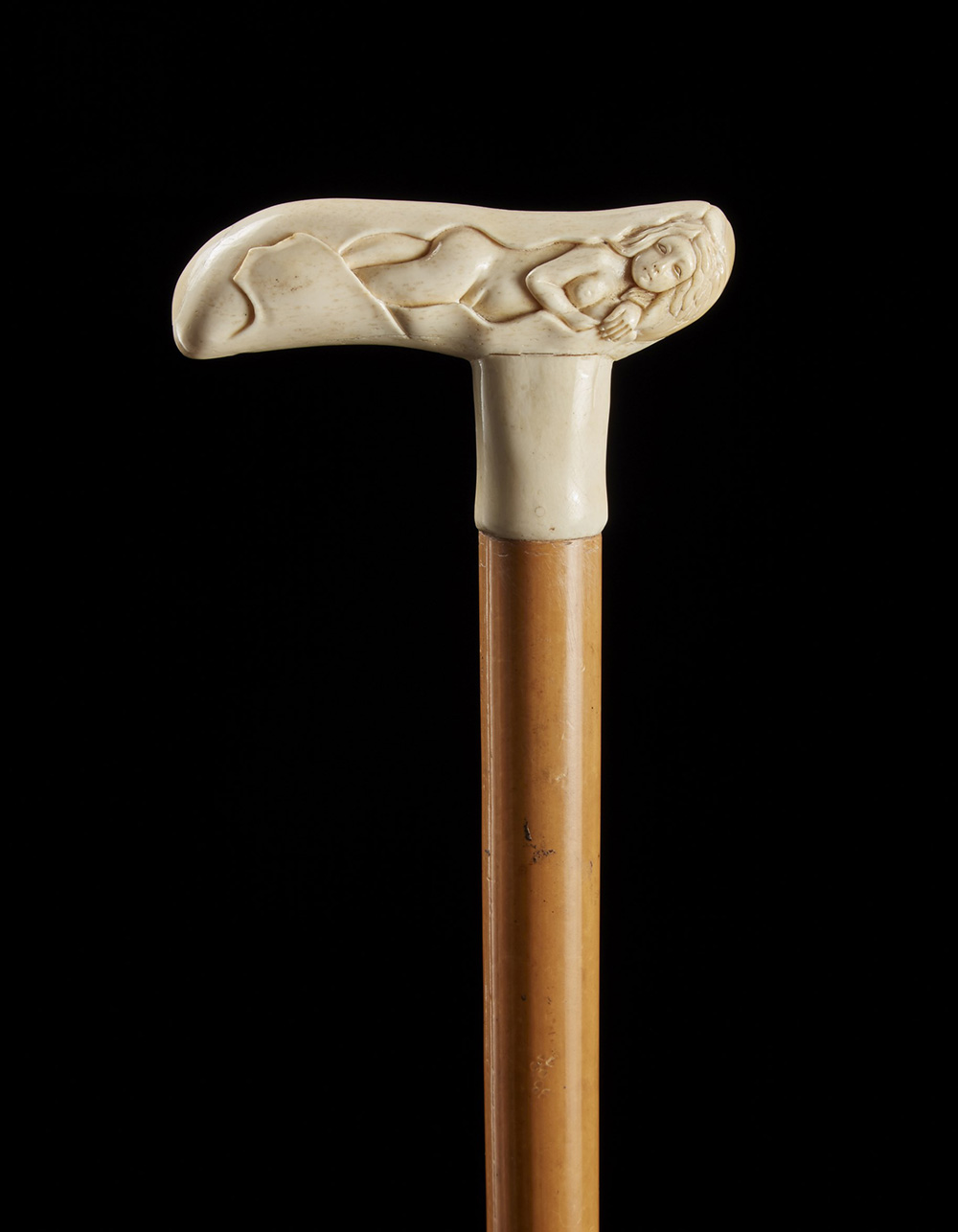 Bastone in malacca con presa in avorio a soggetto erotico con nudo femminile....