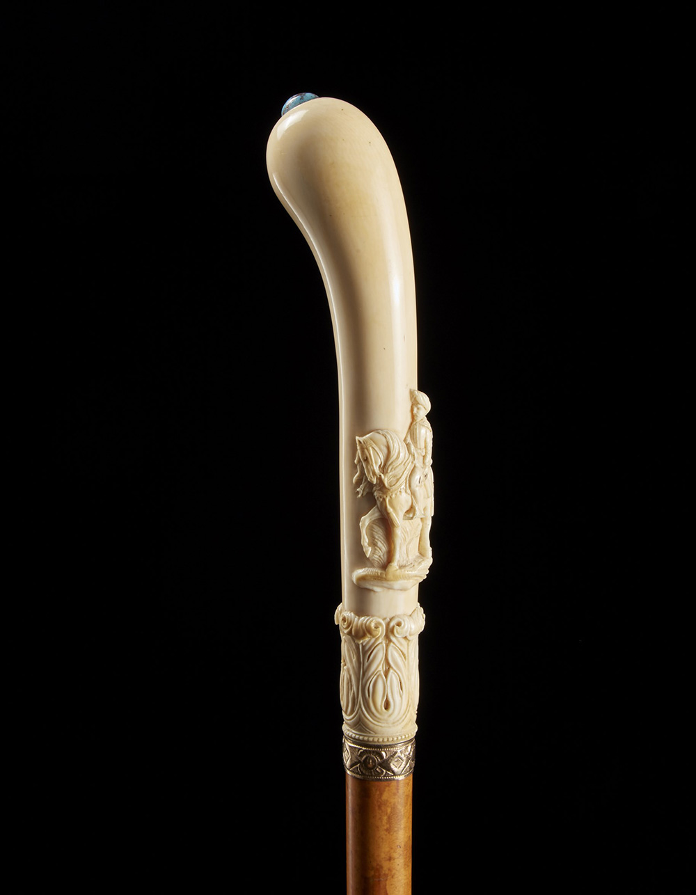 Bastone in malacca con lunga presa in avorio scolpita con altorilievo raffigurante cavaliere a cavallo e sormontata da turchese. Ghiera in oro basso cesellata a motivi stilizzati A Malacca walking stick with ivory handle and turquoise on the top. Gold collar