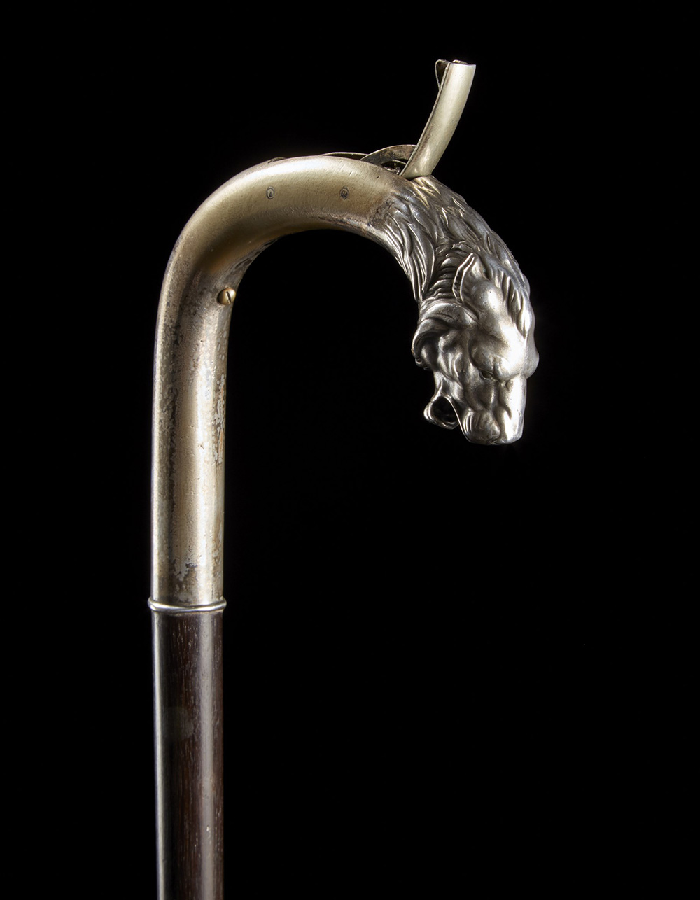 Bastone in ebano con impugnatura ad "acciarino" in alpacca argentata decorata con testa leonina. Inizio sec. XX (difetti) An ebony walking stick with cigarette lighter-shaped handle. Early 20th century (defects)