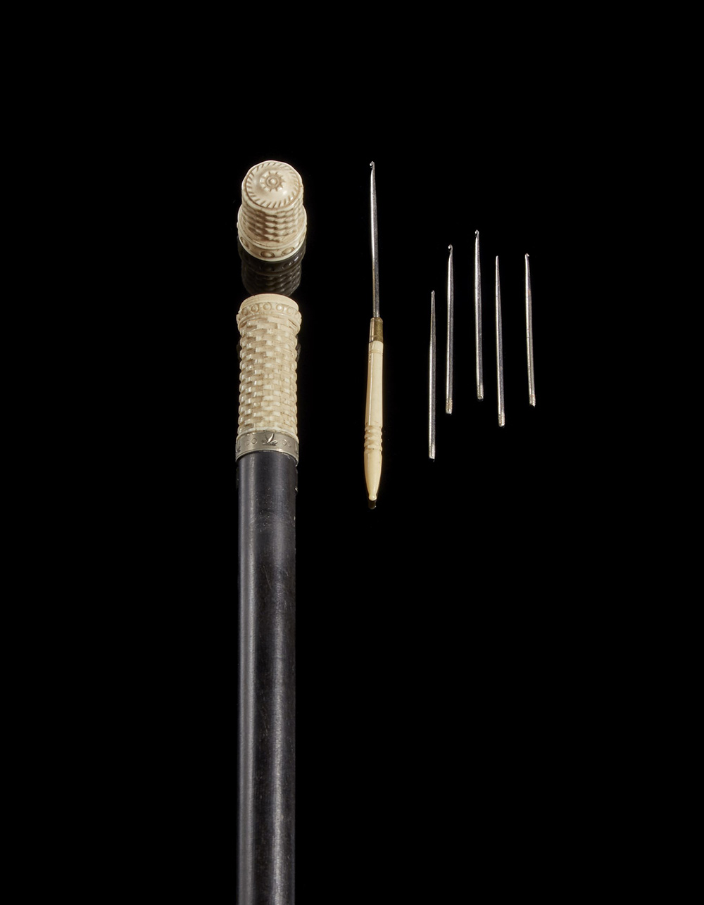 Bastone da sarto con canna in legno ebanizzato e impugnatura in avorio intagliato e tornito celante uncinetti e ditale. Ghiera in metallo e puntale in avorio. Sec. XIX (difetti) An ebonised wood walking stick containing tailoring accessories. Metal collar and ivory tip. 19th century (defects)