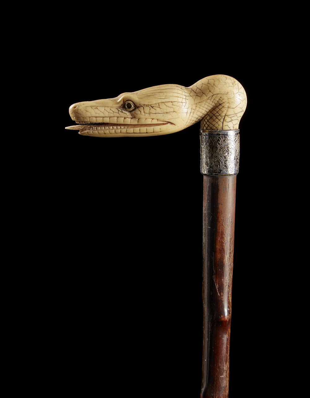 Bastone con canna in nocciolo e impugnatura in avorio scolpita a testa di serpente. Ghiera in argento inciso a volute. Punzoni di Birmingham 1916. Argentiere E.S. A wood walking stick with ivory handle. Silver collar, Birmingham 1916. Silversmith E.S.