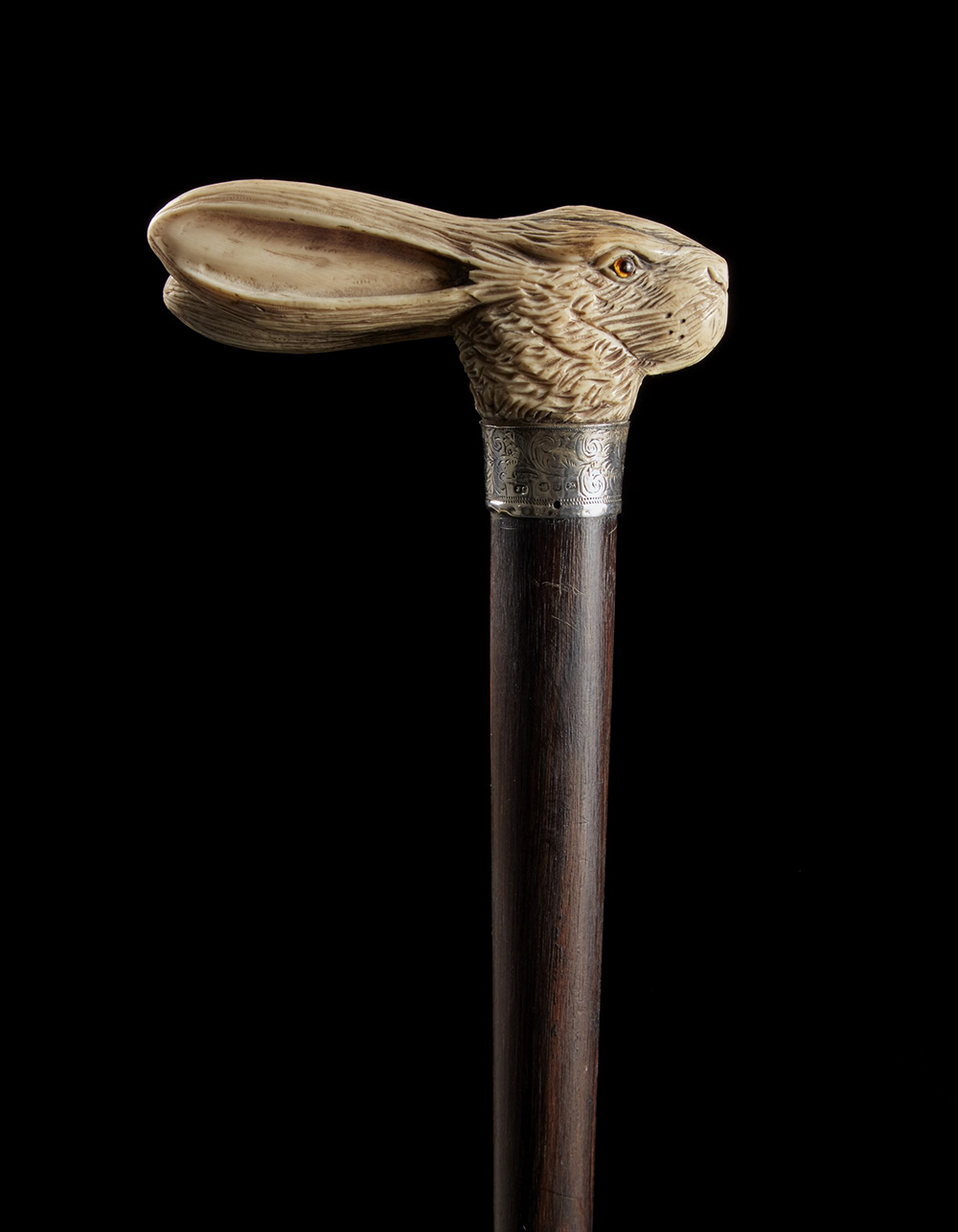 Bastone con canna in legno e presa in avorio a guisa di testa di lepre con...