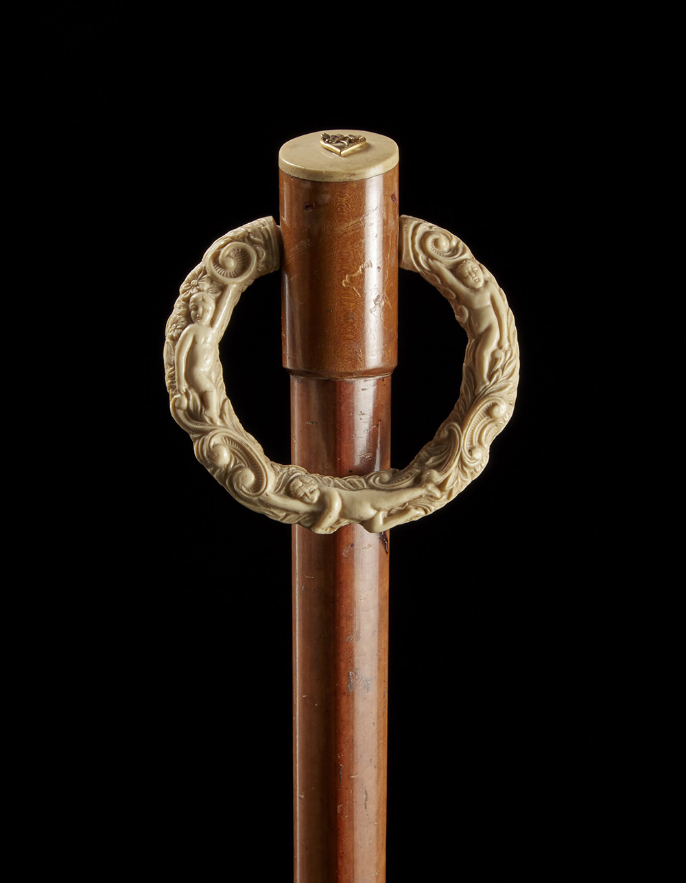 Bastone con canna in legno e impugnatura sormontata da cuore in oro e piccolo rubino e decorata da anello porta foulard in avorio intagliato a putti e volute. Francia, met‡ sec. XIX A wood walking stick with a gold small heart and a ruby. Ivory ring. France, mid-19th century