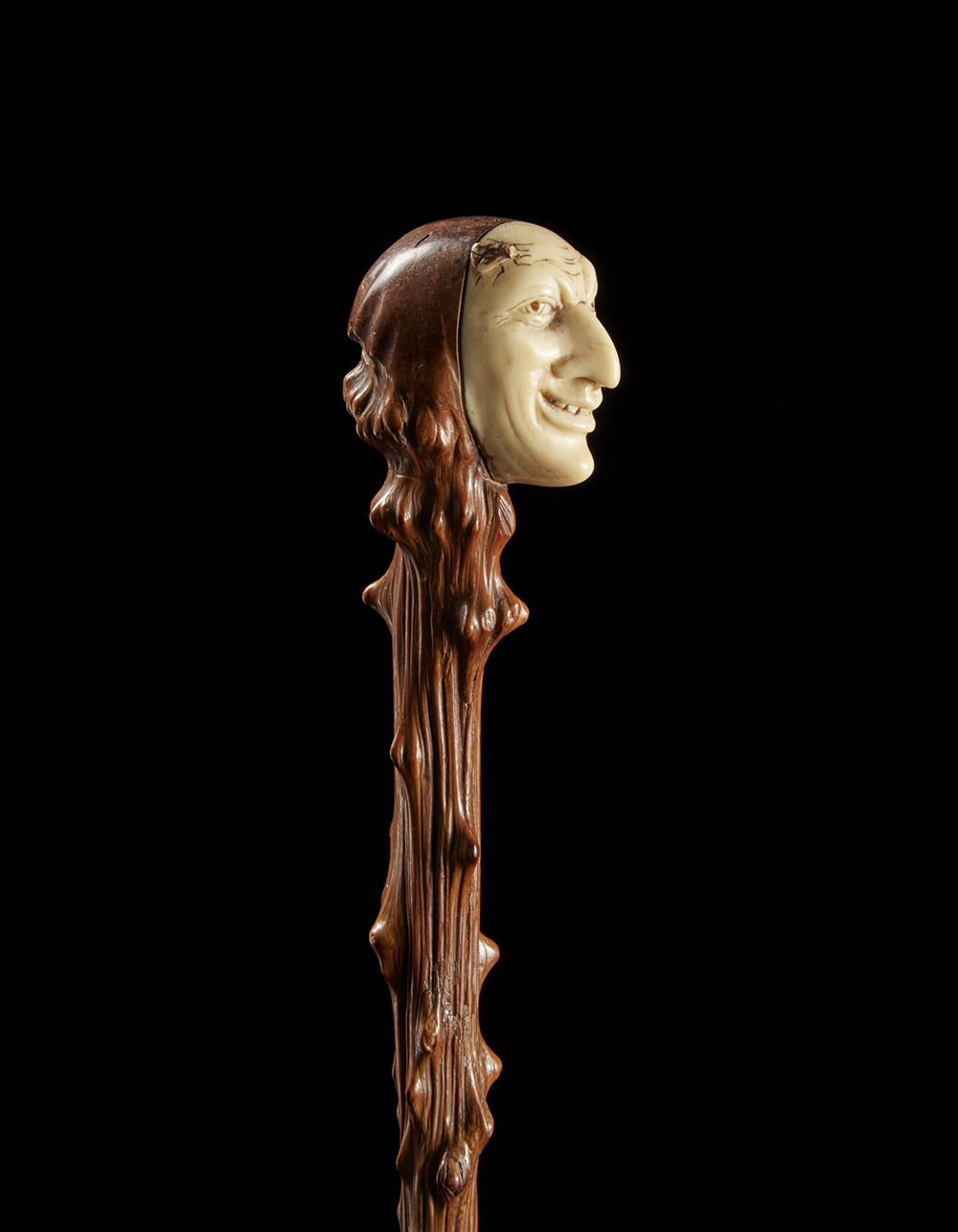 Bastone in legno con presa in avorio con testa di demone decorata ad insetti....