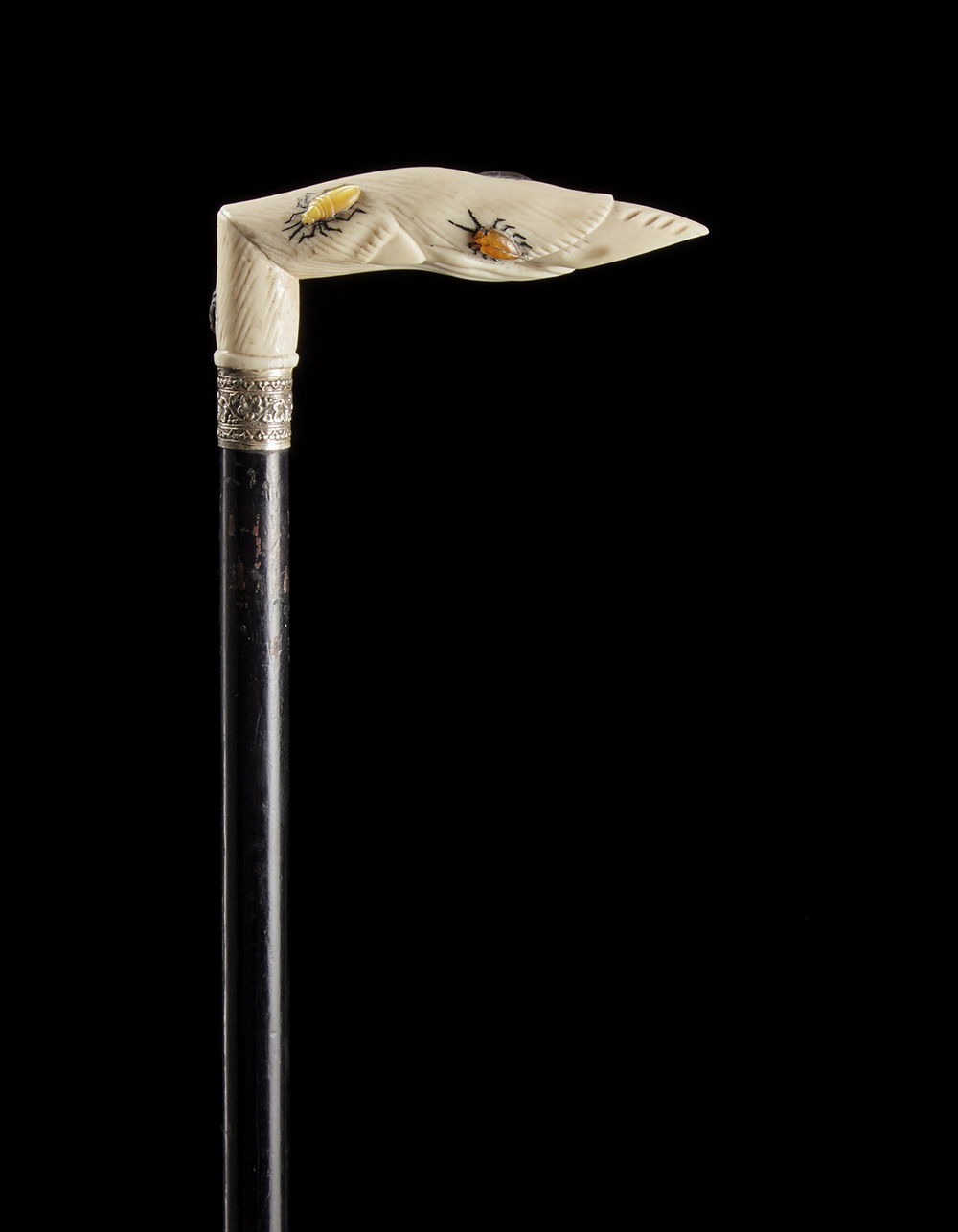 Bastone con presa Shibayama in avorio scolpito a piede caprino e decorato a insetti. Giappone, fine sec. XIX. Ghiera decorata a foglia di edera A walking stick with Shibayama ivory handle. Japan, late 19th century