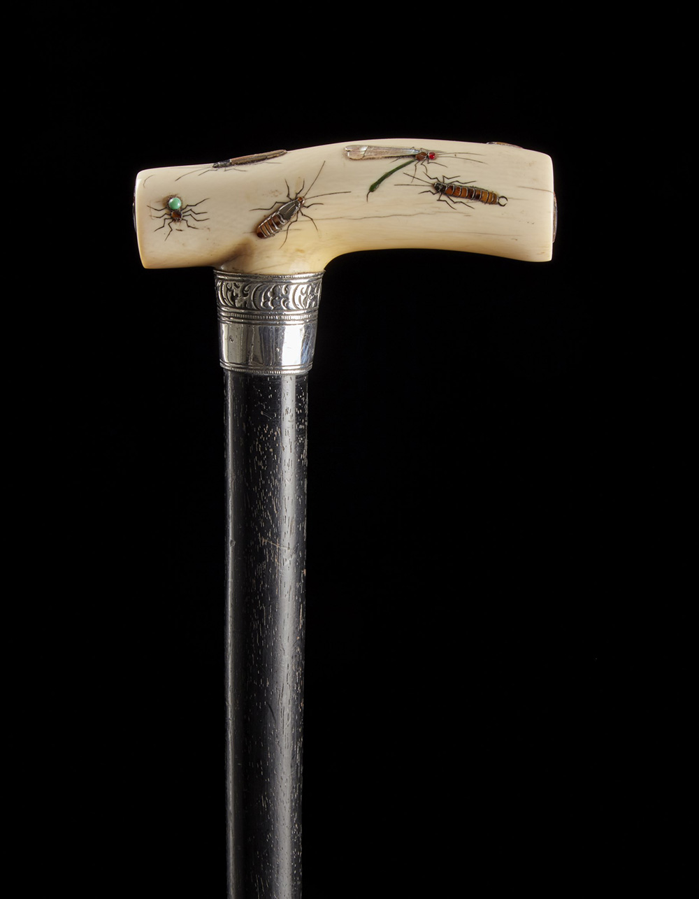 Bastone con presa Shibayama in avorio sagomato, intagliato e inciso a insetti. Giappone, sec. XIX. Ghiera in argento con punzoni abrasi (mancanze) A walking stick with Shibayama ivory handle. Japan, 19th century. Silver collar (losses)