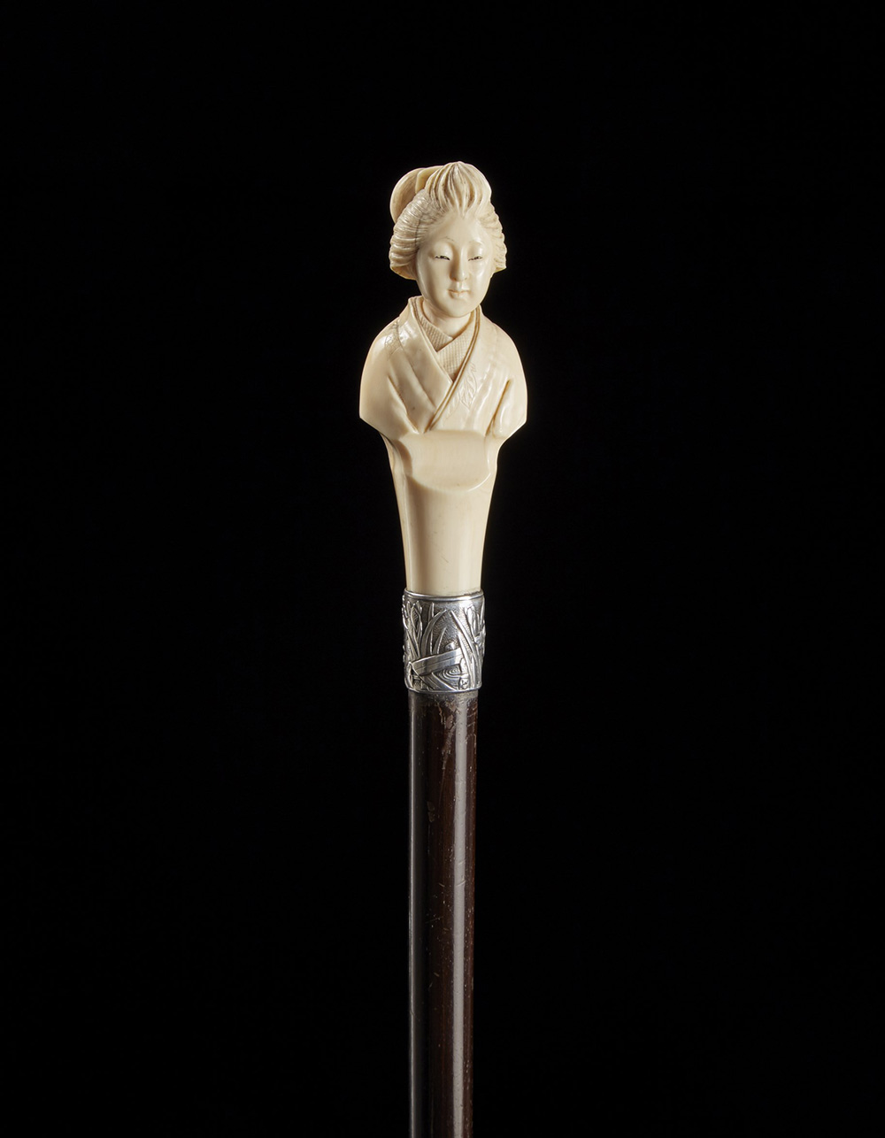 Bastone con canna in legno e impugnatura in avorio scolpito con busto di geisha. Ghiera in argento decorata a foglie. Giappone, inizio sec. XX (difetti) A wood walking stick with ivory handle. Silver collar. Japan, early 20th century (defects)