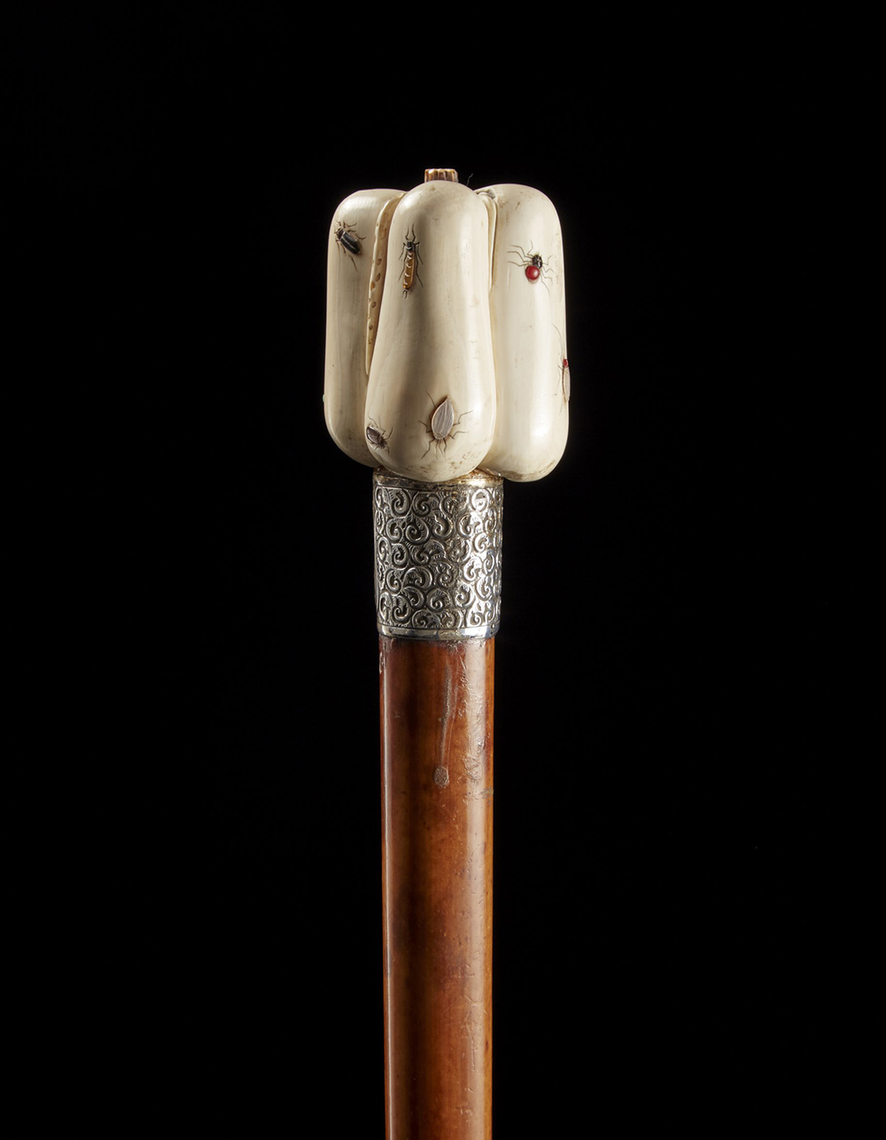 Bastone con presa Shibayama in avorio scolpito a forma di peperone intagliato e inciso a insetti. Giappone, sec. XIX. Punzoni di Londra 1916 A walking stick with Shibayama ivory handle. Japan, 19th century. London marks 1916