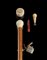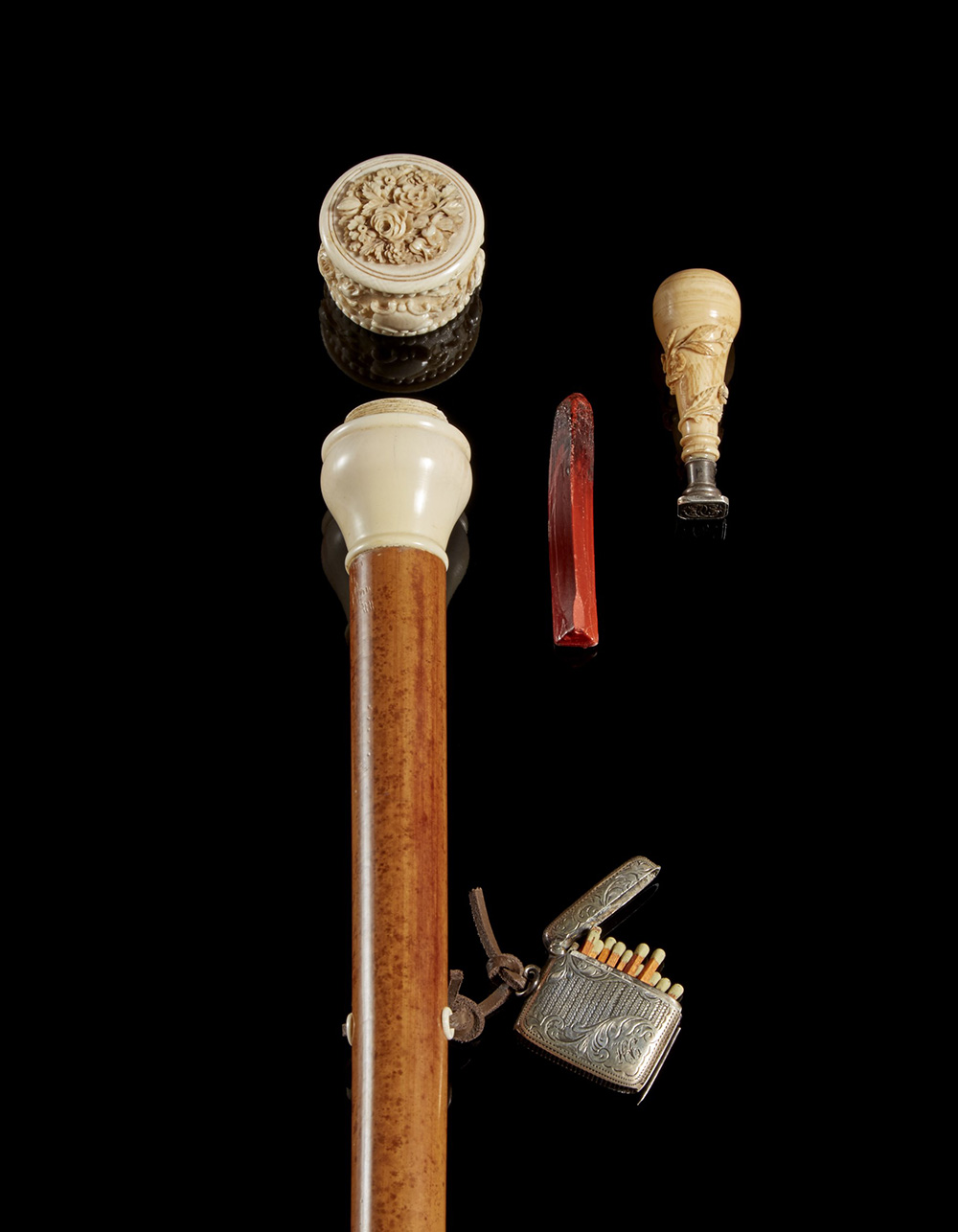 Bastone con canna in malacca e presa in avorio scolpito a fiori celante ceralacca e sigillo in avorio tornito. Fusto con foro passante e portafiammiferi in argento inciso. Inghilterra sec. XIX A Malacca walking stick with ivory handle. Silver match holder. England, 19th century