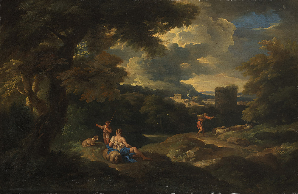 Tavella Carlo Antonio (Milano 1668 - Genova 1738) "Paesaggio con pastori e torre" olio su tela (cm 49x74)In cornice Tavella Carlo Antonio (1668-1738) "Landscape with herdsmen" oil on canvas (cm 49x74) Framed