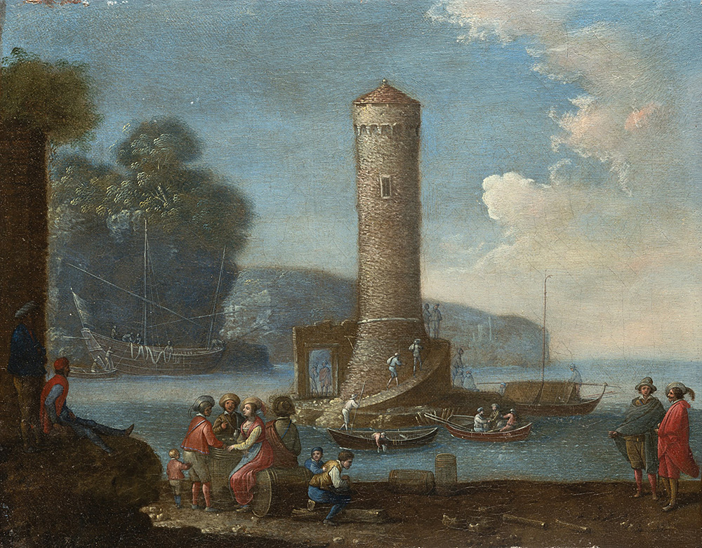 Ciafferi Pietro detto lo Smargiasso (Pisa 1600 - 1654) (attr.)" Scena di porto con torrione" olio su tela (cm 33x41,5)In cornice Ciafferi Pietro called "Lo Smargiasso" (1600-1654) (Attributed to) "Landscape with port" oil on canvas (cm 33x41,5) Framed