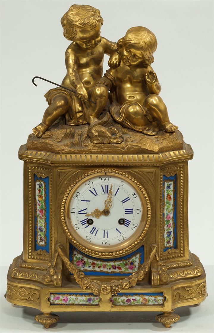 decorato con due fanciulli che giocano con uno scoiattolo; lungo il corpo della pendola sono presenti inserti in porcellana dipinta di Sevres
