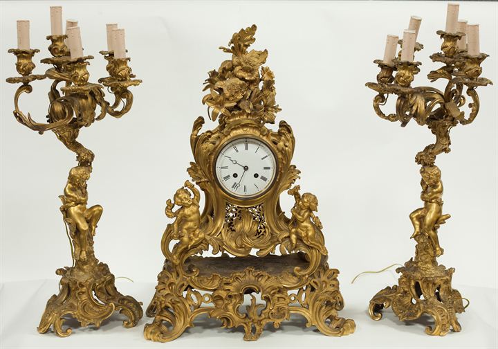Lotto composto da un orologio e due candelabri a sei luci; Francia, XIX secolo,