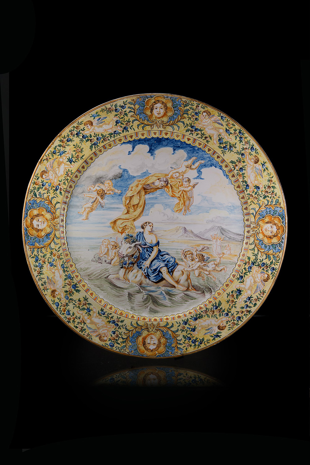 Manifattura Centro Italia. Piatto in maiolica decorato in policromia con Ratto d'Europa nel cavetto, mascheroni e cherubini che sorreggono ghirlande fiorite nella bordura. Inizio sec. XX (d. cm 62) (lievi difetti) Central Italy manufacture. A polychrome decorated majolica dish. Early 20th century (d. cm 62) (minor defects)