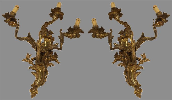 Coppia di appliques in bronzo dorato, a tre luci, di gusto barocco a decoro vegetale